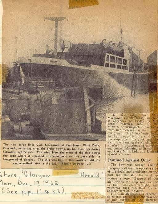 CLAN MACGOWAN was launched for Clan Line at the Greenock Dockyard on 14th December 1962. Two days later she jammed across the James Watt Dock after breaking her moorings in a gale..