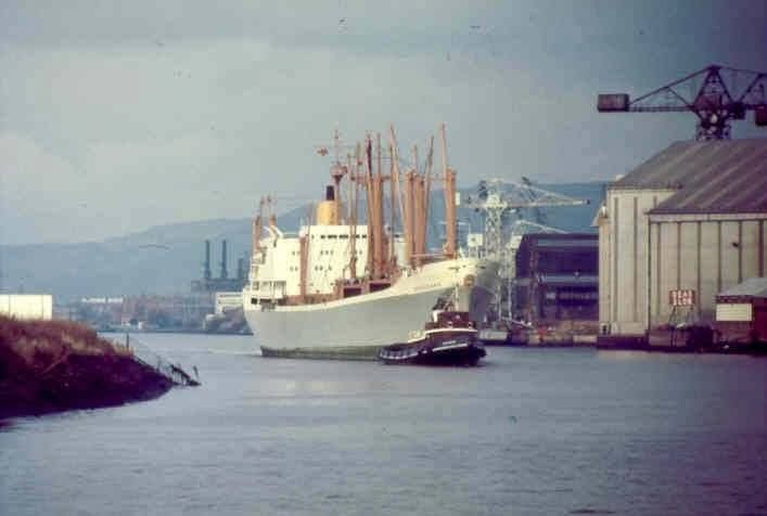 Ben Line's cargo liner BENDEARG launched from Charles Connell's on March 31st 1964 taken in 1975 on a return visit to Glasgow and about to berth in King George V Dock just about opposite her birthplace.